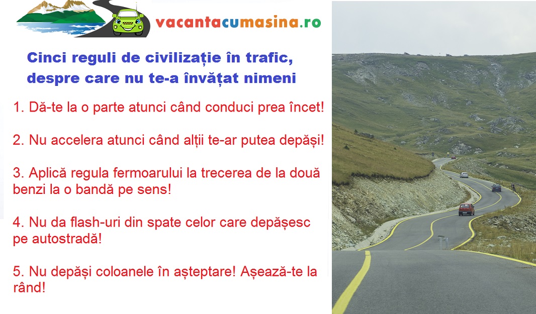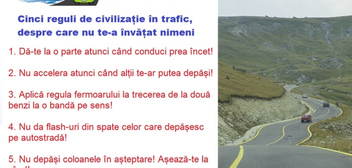 Exista cateva reguli de civilizatie in trafic care, daca s-ar aplica si in Romania, ar face ca sofatul sa fie mai putin stresant, soferii sa fie mai putin nervosi, iar traficul sa se desfasoare mult mai fluent. Sunt reguli de bun simt, despre care nimeni nu te invata nicaieri, dar pe care ar fi ideal ca fiecare sofer sa le puna in practica.